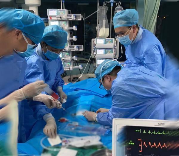 到达华中阜外医院,患者被推入导管室。急诊科主任郑晓晖为患者进行介入干预,在ECMO支持下,郑晓晖在患者右冠状动脉植入2枚支架,在左前降支利用球囊扩张,使患者血流恢复,生命被成功挽救。