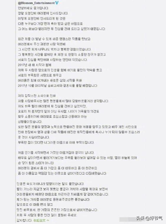 5、2017年7月5日,宋仲基与宋慧乔双方共同发表婚讯,宣布将于10月31日结婚。