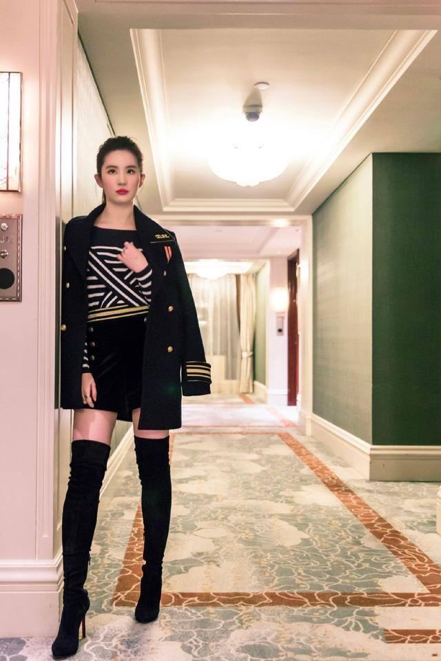 在穿衣打扮上,刘亦菲穿了一件条纹黑色丝绒长裙,外面披了一件机长外套,搭配着长筒靴,看着更加性感有魅力,虽然裙子没有任何暴露成分,却能让人感觉到性感。