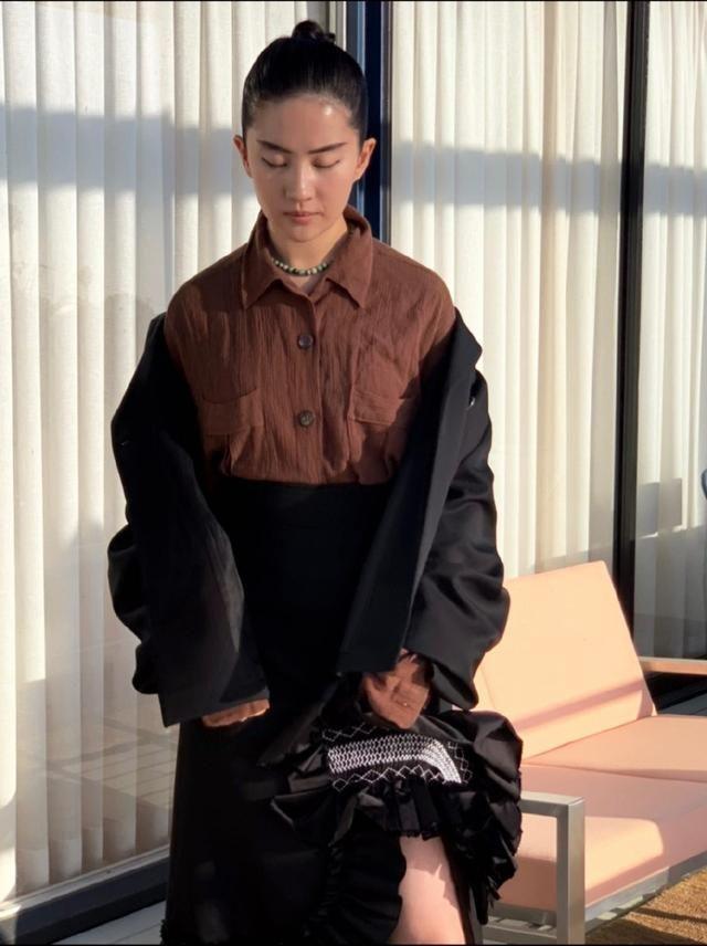 刘亦菲混搭造型特点明显,“八字眉”画得与年轻时的林青霞神似