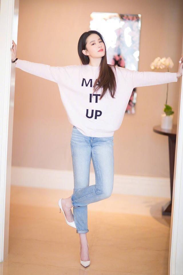 大家都说,漂亮的女人,无论穿什么都是最引人注目的,下图照片中,刘亦菲穿了一件长袖上衣外套,搭配牛仔紧身长裤,看着清纯,加上那笔直的大长腿更是令人羡慕。